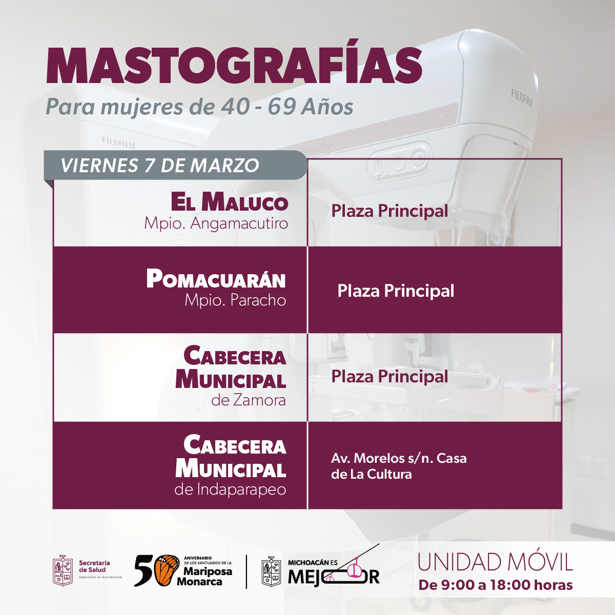 Morelia, Michoacán.- Durante la primera semana de marzo, la Secretaría de Salud de Michoacán (SSM) desplegará sus cuatro unidades móviles de mastografía a siete municipios para la detección oportuna de cáncer de mama en mujeres de 40 a 69 años.