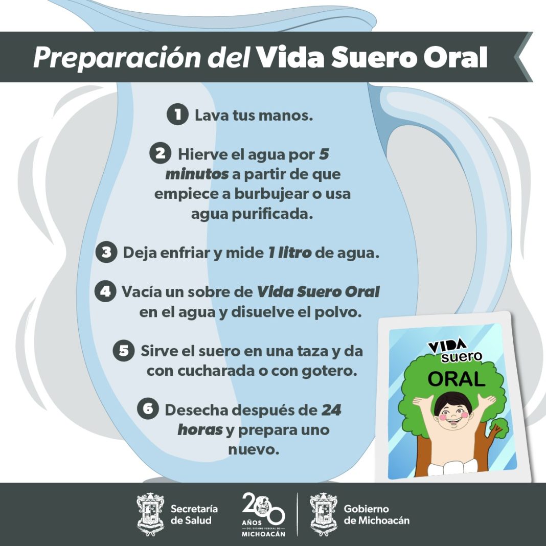 La Secretaría de Salud de Michoacán (SSM) informa a la población que durante la temporada de calor las familias pueden solicitar de manera gratuita en su centro de salud más cercano, los sobres de Vida Suero Oral, polvo que disuelto en agua repone los líquidos corporales de forma inmediata, evitando la deshidratación.