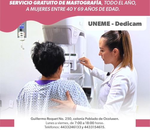 Además, refuerza acciones de detección oportuna en mujeres de 40 a 69 años con la realización de mastografías gratuitas en cuatro unidades móviles que recorren los 113 municipios, así como las siete fijas ubicadas en los hospitales Dr. Miguel Silva, de Zamora, Zitácuaro, Uruapan, de la Mujer; así como la Unidad de Especialidades Médicas para la detección temprana de cáncer de mama (Uneme Dedicam) y el Instituto Michoacano de Oncología.