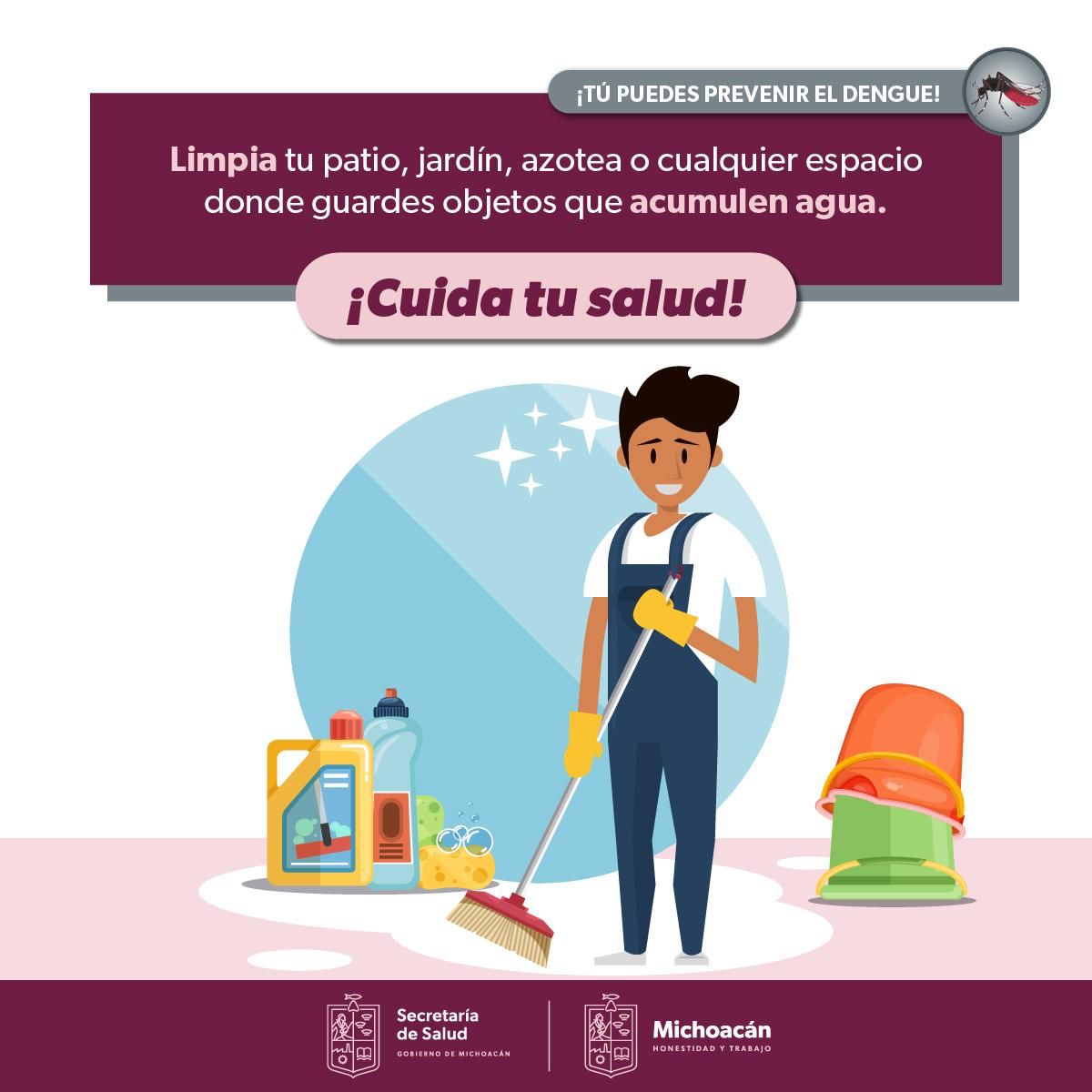 Prevenir el dengue depende de todos, es por ello que la Secretaría de Salud de Michoacán (SSM) invita a la población a intensificar las tareas de saneamiento para evitar posibles criaderos del mosco transmisor en la casa, escuela o trabajo.