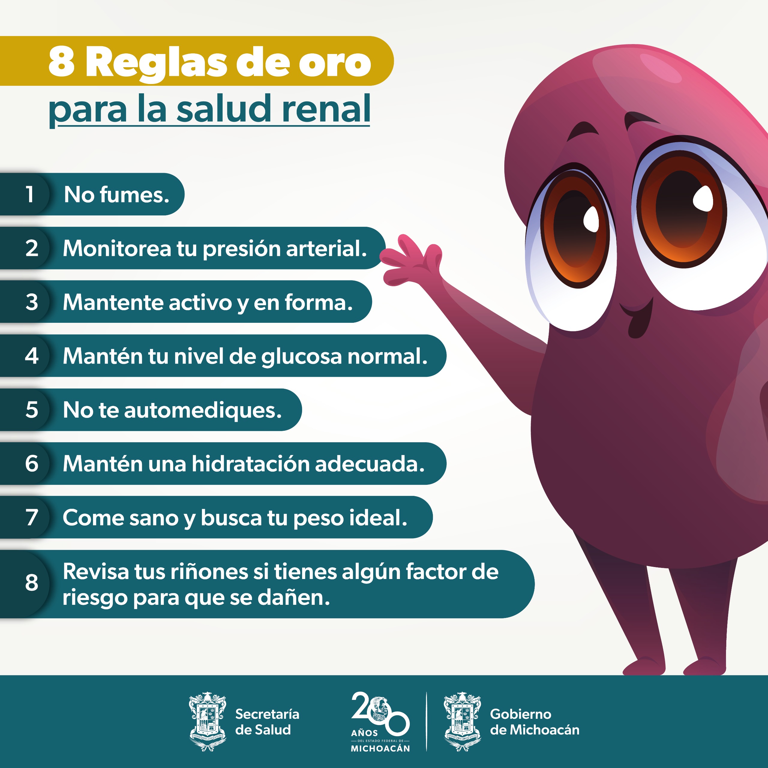 Para prevenir el desarrollo de la Enfermedad Renal Crónica, que provoca que los riñones pierdan su capacidad de funcionar, la Secretaría de Salud de Michoacán (SSM) recomienda seguir ocho reglas de oro de la salud renal.