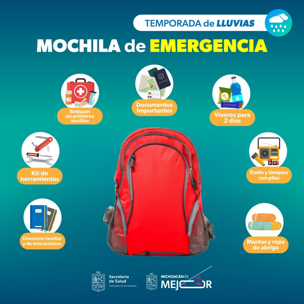 Frente a la temporada de lluvias y huracanes, la Secretaría de Salud de Michoacán (SSM) te guía para armar de manera preventiva, una mochila para casos de emergencia, en caso de incremento en niveles de ríos y arroyos, así como desbordamientos e inundaciones en zonas bajas.