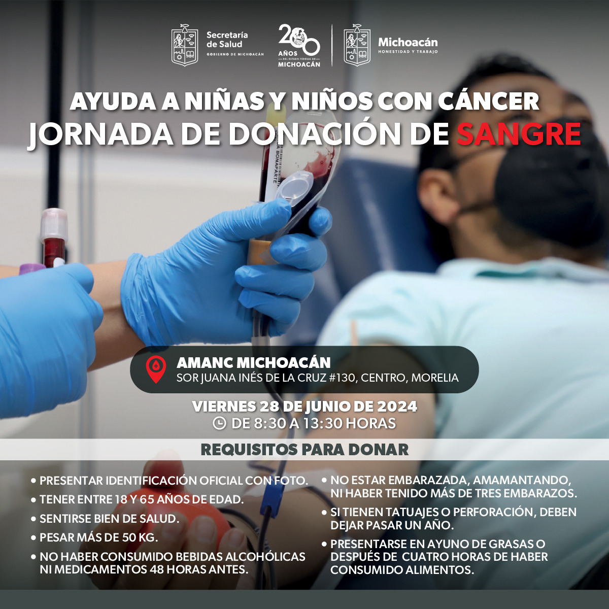 La Secretaría de Salud de Michoacán (SSM) y la Asociación Mexicana de Ayuda a Niños con Cáncer (AMANC) en el estado invitan a la población mayor de 18 años, a participar en la campaña Regala Vida, que consiste en donar sangre para ayudar a infancias con padecimiento oncológico, quienes incluso llegan a necesitar hasta 100 transfusiones sanguíneas durante su tratamiento curativo.