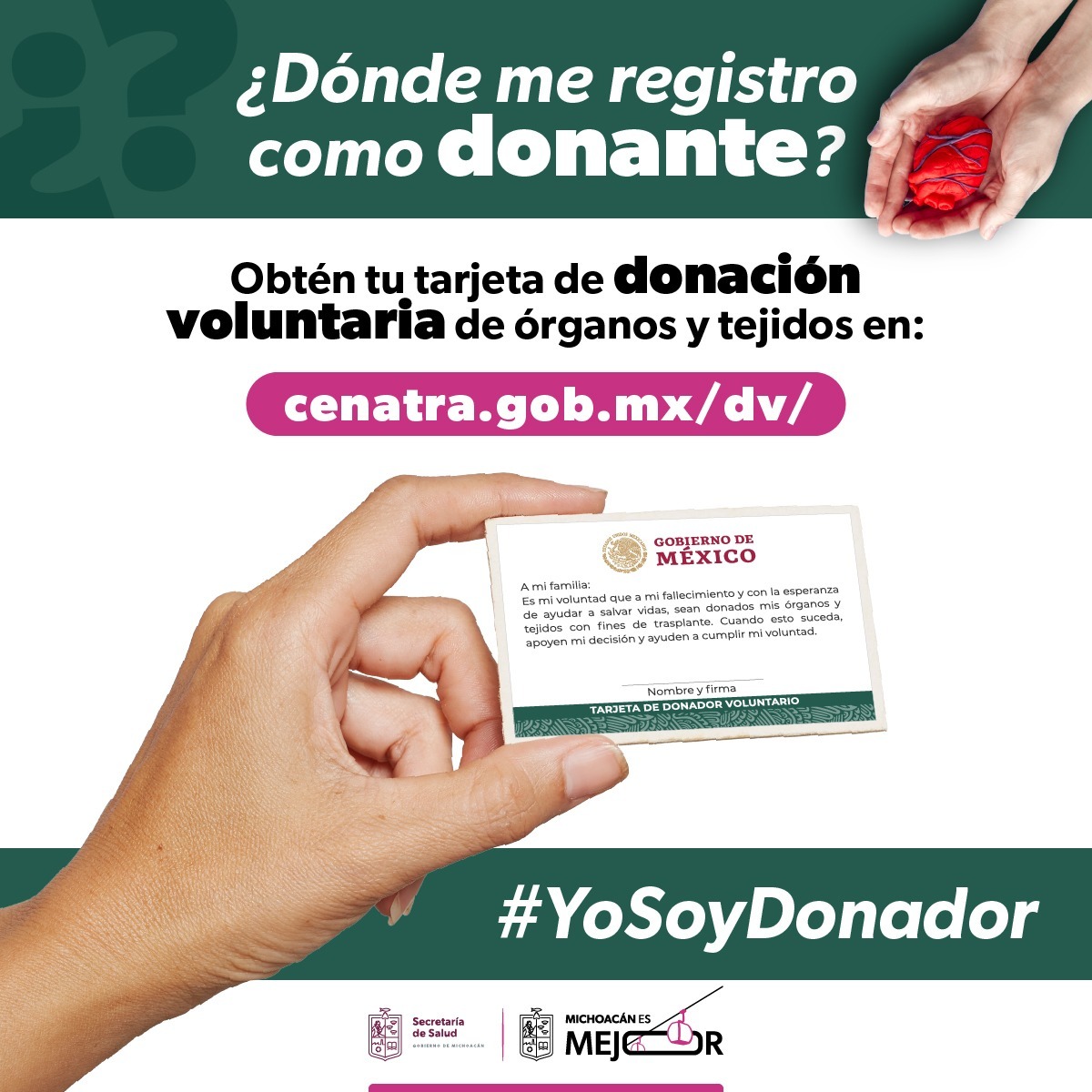 La Secretaría de Salud de Michoacán (SSM) invita a la población a sensibilizarse y tomar conciencia sobre lo importancia de la donación de órganos, un acto que ofrece esperanza de vida a pacientes que, en su mayoría, se encuentran en etapas terminales.
