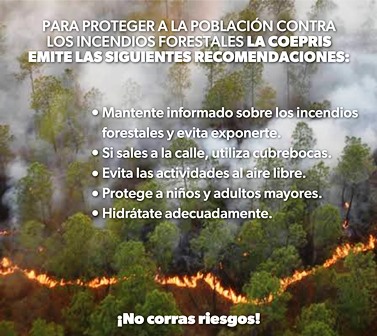 Para ello la Comisión Estatal para la Protección contra Riesgos Sanitarios (Coepris) cuenta con 54 brigadistas distribuidos en ocho municipios, quienes tienen a su cargo la encomienda de proteger la salud de la población que pudiera estar vulnerable, así como prevenir riesgos sanitarios y enfermedades respiratorias por la inhalación del humo.
