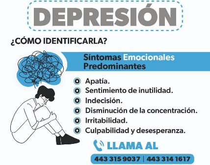 Para detectar y asistir a la población con depresión, la SSM cuenta con servicios de atención a la salud mental en 40 unidades médicas; un hospital psiquiátrico; y cinco Centros Comunitarios de Salud Mental y Adicciones (Cecosama) en Morelia, Zamora, Uruapan, Zitácuaro y Lázaro Cárdenas; además de la línea de ayuda “Hablemoos”, disponible las 24 horas del día en los números 443 334 1617 y 443 315 9037.