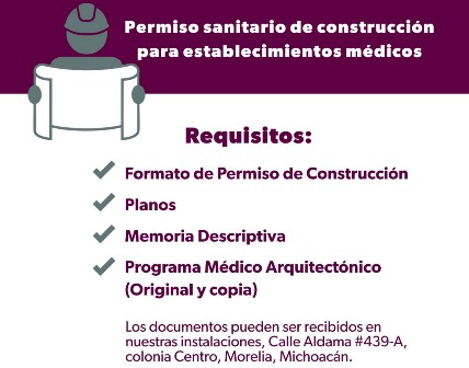 La Secretaría de Salud de Michoacán (SSM) hace un llamado a los profesionales de la salud e interesados en edificar o remodelar establecimientos médicos, a tramitar su permiso sanitario de construcción, el cual garantiza la calidad y seguridad de sus instalaciones.