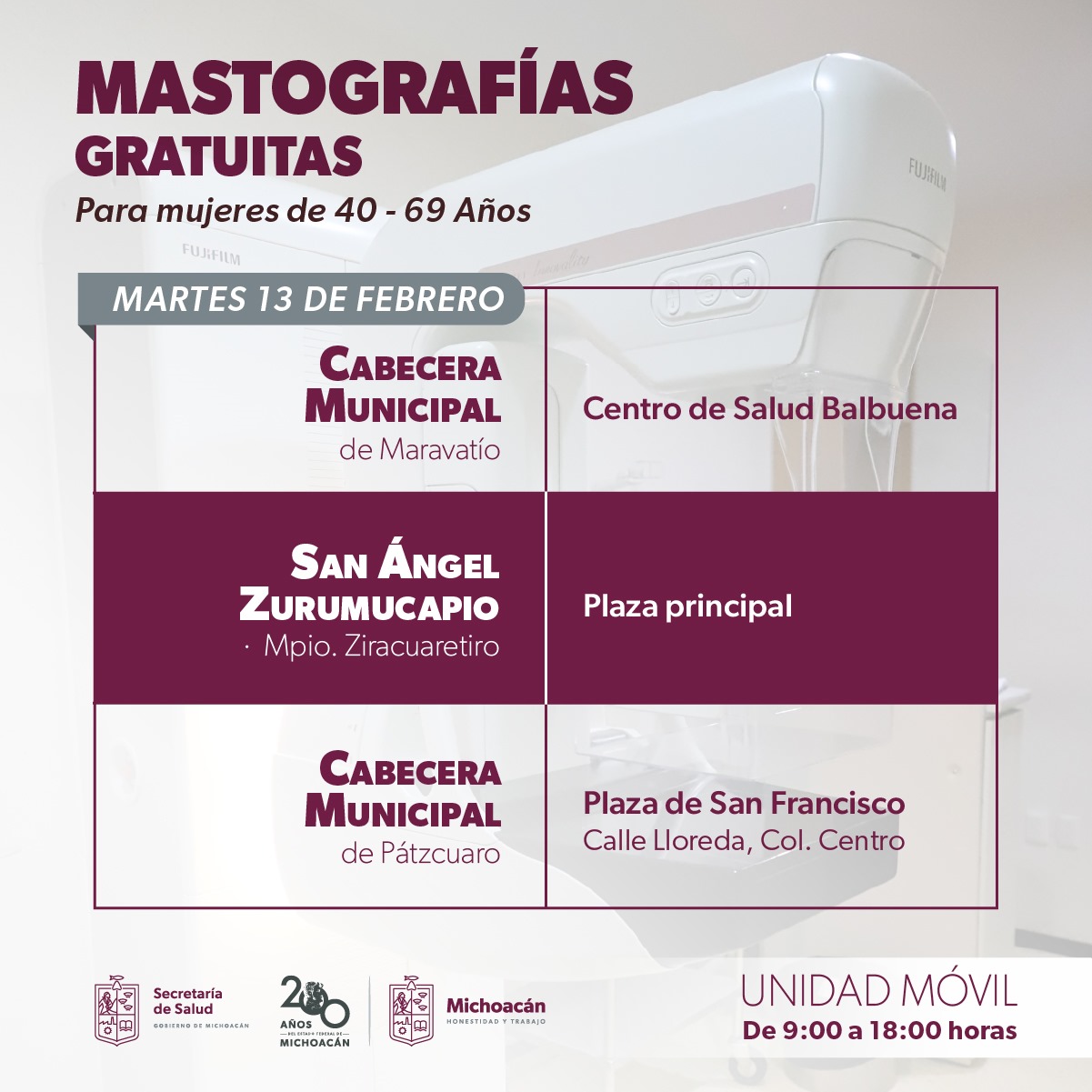 El 12 de febrero las mastografías podrán solicitarse en el centro de salud de Tziritzícuaro, municipio de Maravatío, así como en la presidencia municipal de Paracho y Lagunillas. El 13 de febrero los estudios se ofrecerán en el centro de salud de Balbuena, municipio de Maravatío y en las plazas principales de San Ángel Zurumucapio, municipio de Ziracuaretiro y en Pátzcuaro.