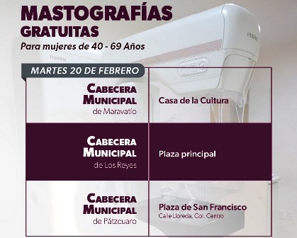 El 20 de febrero, las mastografías serán practicadas en la Casa de la Cultura de Maravatío, en la plaza principal de Los Reyes y en el centro de Pátzcuaro. Mientras que el miércoles 21, los mastógrafos móviles estarán presentes en la explanada del Tribunal de Justicia de Morelia, en la presidencia municipal de Jiménez, y continuará la jornada de Los Reyes en la plaza principal.