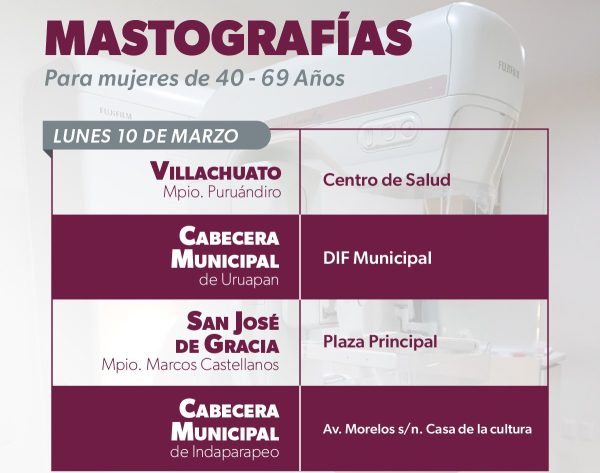 Por lo pronto del 10 al 14 de marzo a Puruándiro, Uruapan, Marco Castellanos, Indaparapeo, Paracho, Morelia, Jiquilpan y Quérendaro serán la sede de la instalación mastógrafos móviles.