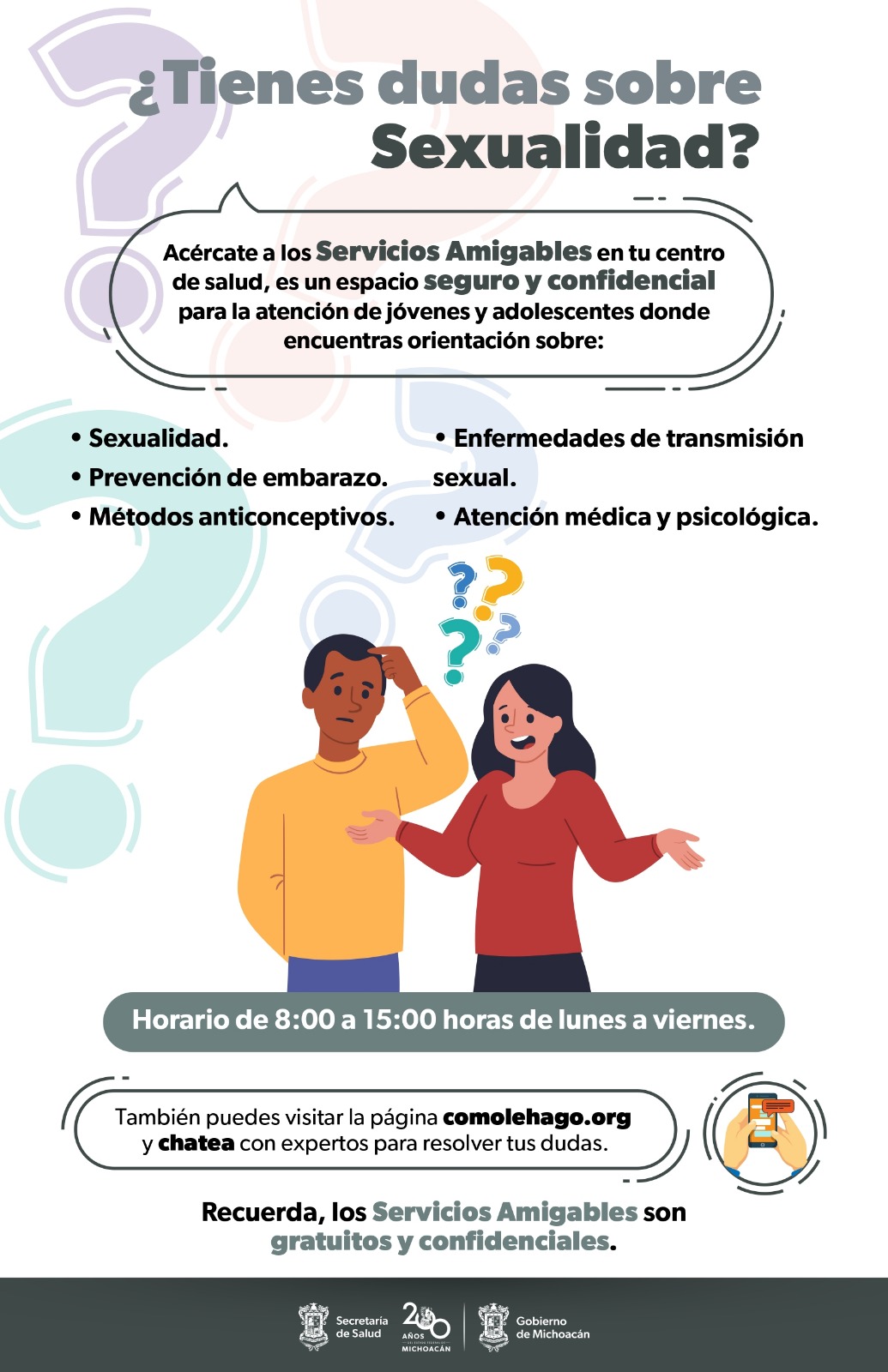 Es así, que la institución invita a las juventudes y adolescencias michoacanas a acercarse a uno de nuestros módulos a recibir información para prevenir un embarazo no deseado, evitar una infección de transmisión sexual, utilizar un método anticonceptivo o sólo recibir información sobre el ejercicio de su sexualidad.