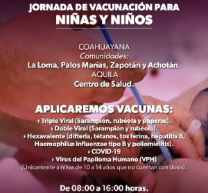 En Aquila, médicos y enfermeras recorrerán colonias de la cabecera municipal y se instalará un módulo de inmunización en el centro de salud, donde padres y madres podrán llevar sus hijos en horario de 08:00 a 14:30 horas.
