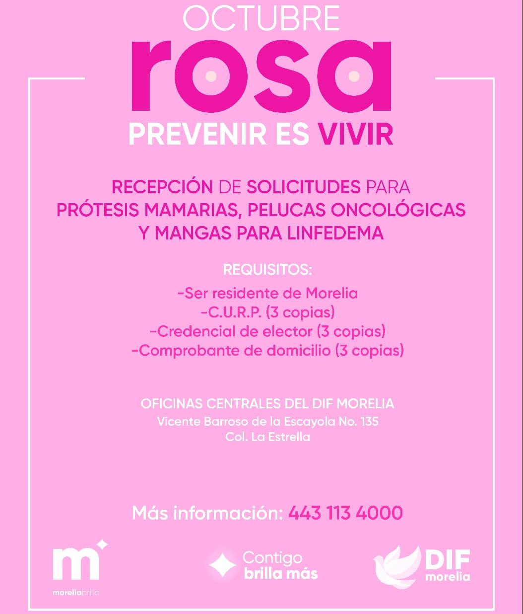 El DIF Morelia, que encabeza la Presidenta Honoraria, Paola Delgadillo Hernández, ha abierto la recepción de solicitudes para la entrega gratuita de prótesis mamarias, pelucas oncológicas y mangas para linfedema durante el mes de octubre, con el objetivo de apoyar a las mujeres que han superado o están en tratamiento contra el cáncer de mama.