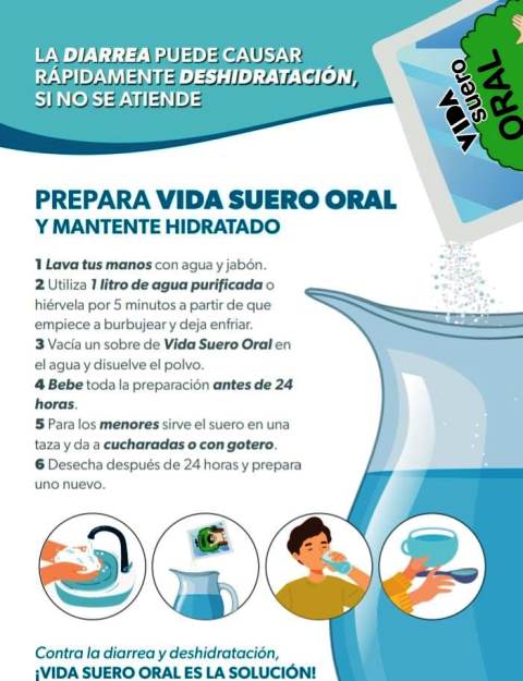La diarrea puede causar rápidamente deshidratación si no se atiende, por eso, se recomienda beber abundantes líquidos entre ellos vida suero oral, el cual después de su preparación deberá consumirse antes de 24 horas.