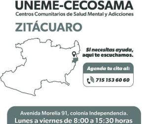 Si tienes algún familiar o amigo que necesita atención psicológica, también puedes pedir informes para ayudarlo a conocer los servicios del Cecosama, que cuenta con unidades en los municipios de Morelia, Zamora, Uruapan y Lázaro Cárdenas.