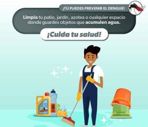 Con la limpieza se retiran y eliminan los objetos donde los mosquitos pueden reproducirse, como cubetas, tambos, botes y botellas con agua, así como llantas u otros recipientes que puedan acumular líquido, dado que estos insectos suelen criarse en agua limpia.