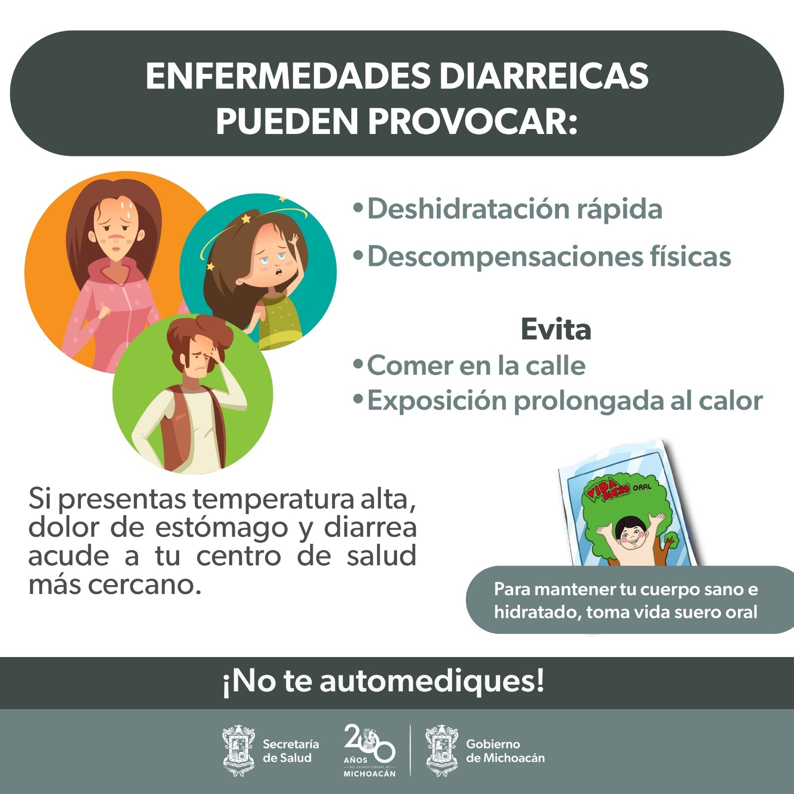 Es así, que la Secretaría de Salud de Michoacán (SSM), invita a la población evitar consumir alimentos callejeros de dudosa procedencia, beber abundantes líquidos, pues esto le permite al cuerpo recuperar todo lo que perdió con la diarrea, principalmente en niñas y niños menores de 5 años y adultos mayores.