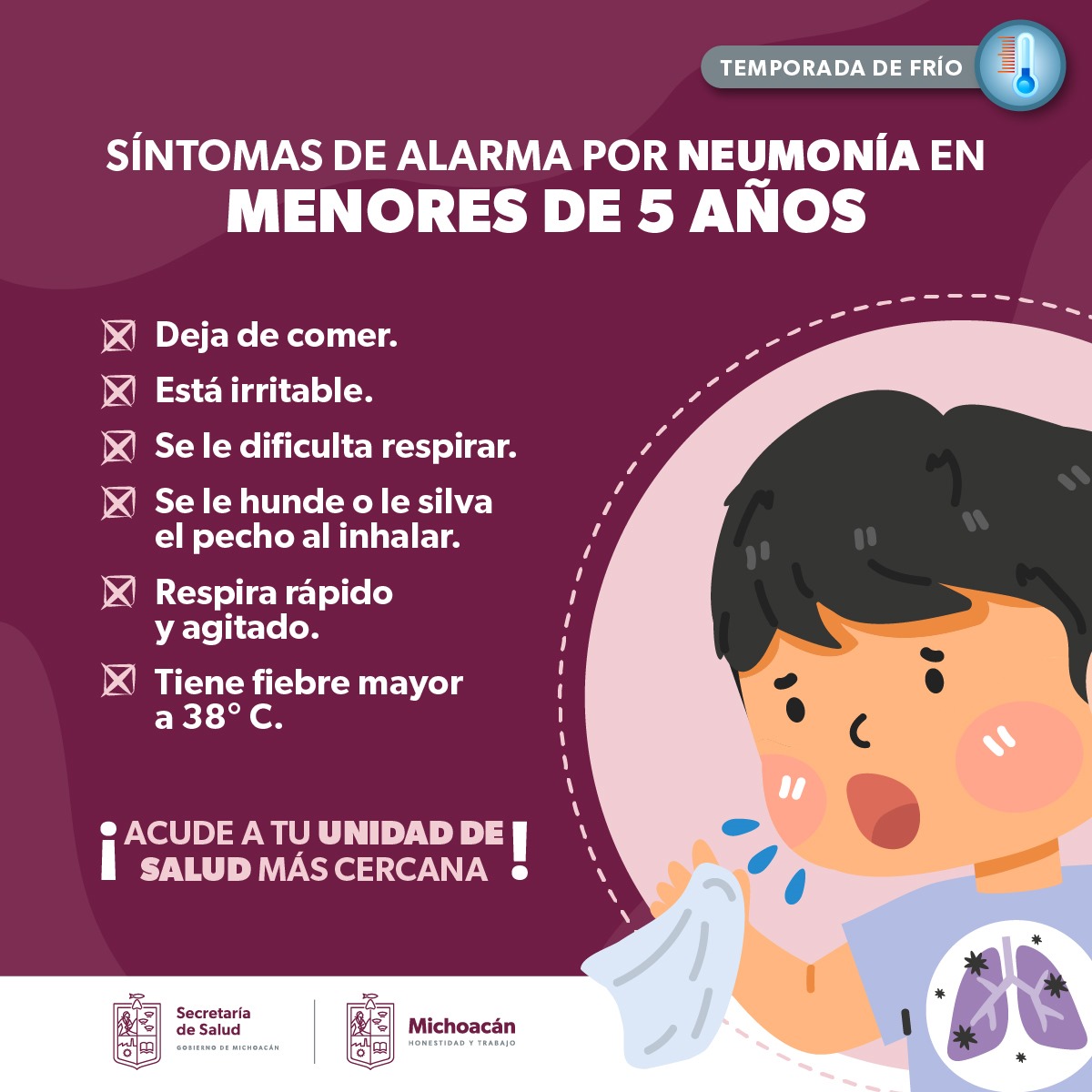 En temporada de frío, las infecciones en los pulmones son más frecuentes, es por ello que la Secretaría de Salud de Michoacán (SSM) exhorta a la población a detectar a tiempo los signos de alarma, como silvido en el pecho y hundimiento al respirar.