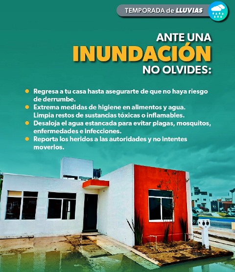 Reportar las coladeras que estén tapadas y mantenlas limpias, colocar costales rellenos de arena para evitar que el agua entre a las casas, retirar los objetos que puedan ser arrastrados por el agua y en caso de inundación, cortar la corriente eléctrica y desalojar el espacio.
