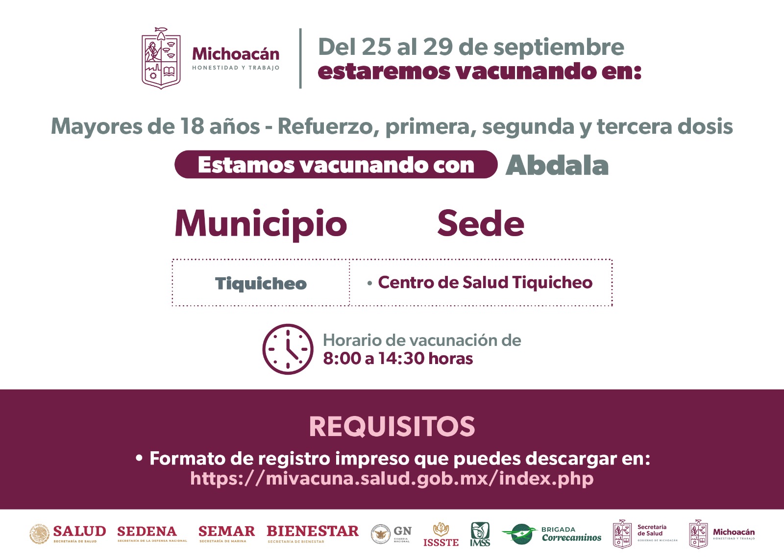 Morelia, Michoacán.- En Michoacán se continúa con la aplicación de primera, segunda y tercera dosis, así como el refuerzo de la vacuna contra el COVID-19 de marca Abdala, para población mayor de 18 años.