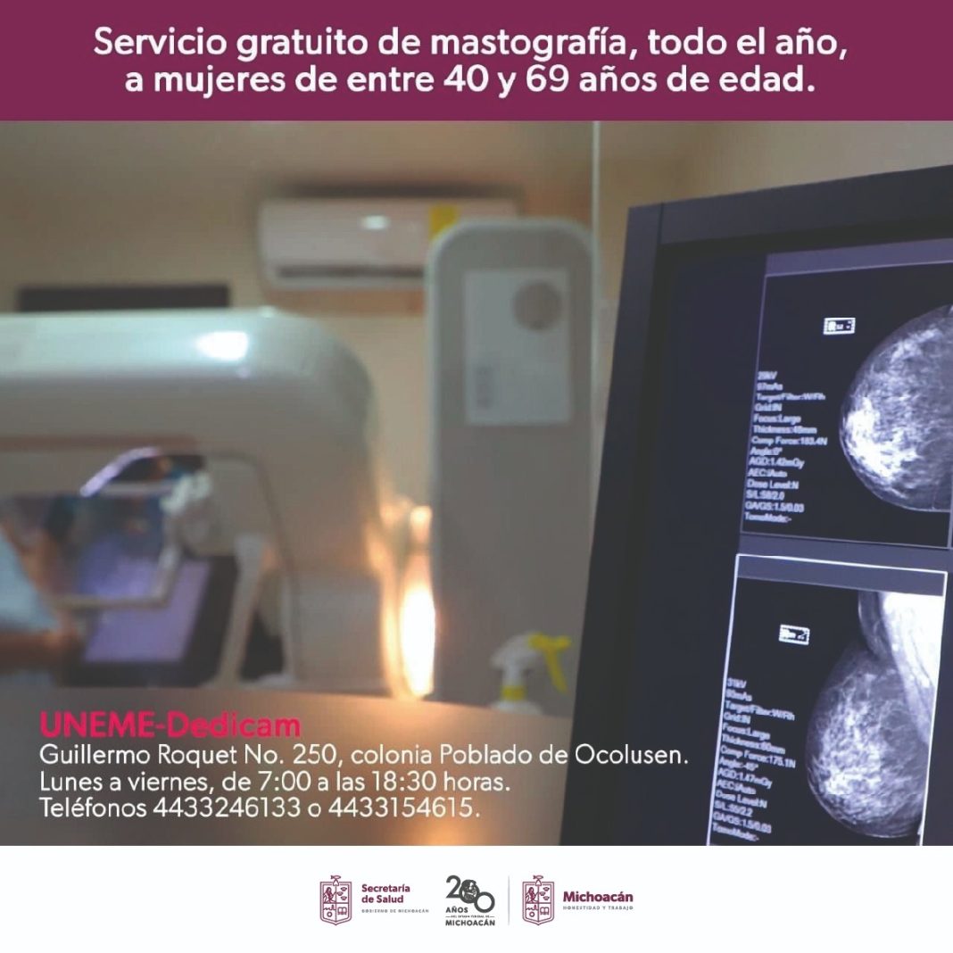 En Morelia, todas las mujeres de 40 a 69 años de edad pueden solicitar una mastografía gratuita en la Unidad de Especialidades Médicas dedicada al Cáncer de Mama (Uneme Dedicam) de la Secretaría de Michoacán (SSM), para detectar y tratar a tiempo el cáncer de seno.