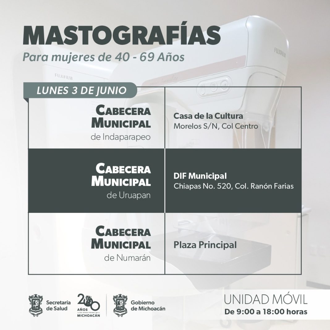 El lunes 3 de junio las mastografías se efectuarán en la Casa de la Cultura de Indaparapeo, en la explanada del DIF municipal de Uruapan y en la plaza principal de Numarán. El martes 4, los estudios se realizarán en la plaza de la tenencia San Lucas Pío de Chucándiro, el centro de salud de la comunidad Caltzontzin de Uruapan y frente a la farmacia Loto de la localidad El Ensueño, de La Piedad.