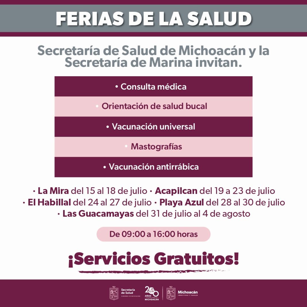 Lázaro Cárdenas, Mich.- La Secretaría de Salud de Michoacán (SSM) y la Secretaría de Marina llevarán ferias de la salud a la población de comunidades y tenencias de Lázaro Cárdenas del 15 de julio al 4 de agosto, para detectar y tratar a tiempo enfermedades crónicas e infecciosas.