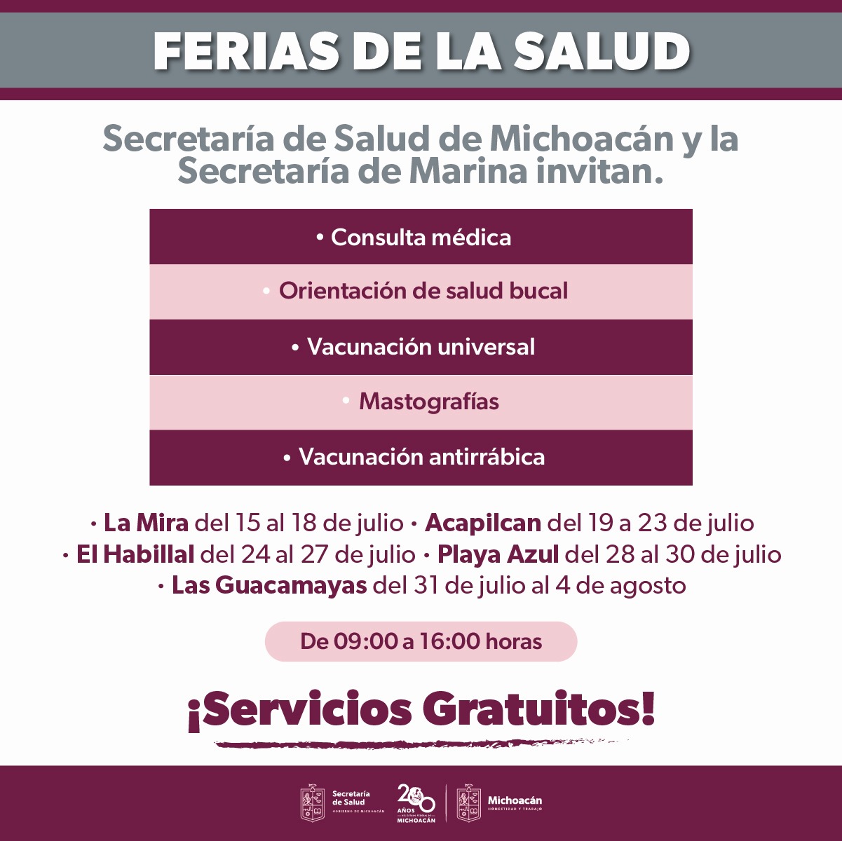 Consulta general, dental y de nutrición, vacunación universal, estudios de laboratorio, mastografías, vacunación antirrábica y capacitaciones para prevenir el dengue en casa son las actividades que médicos y enfermeras de la jurisdicción sanitaria de Lázaro Cárdenas ofrecerán sin costo a la población abierta en horario de 8 a 14 horas.