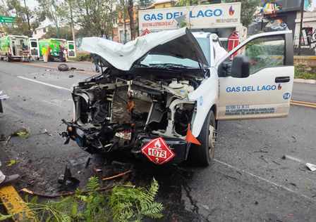 Aparatoso choque entre camioneta gasera y dos autos deja dos lesionados