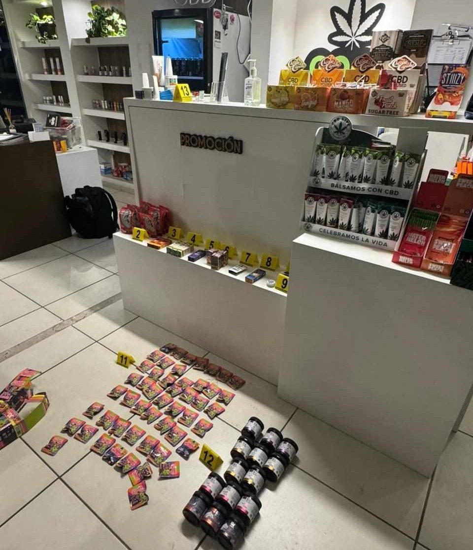 En el sitio fueron decomisadas 12 cajas de gomitas hechas a base de marihuana; 50 bolsas de gomitas; 14 frascos con gomitas; dos cajas con vaper con una sustancia de color ámbar; así como diversos productos más hechos a base de marihuana.