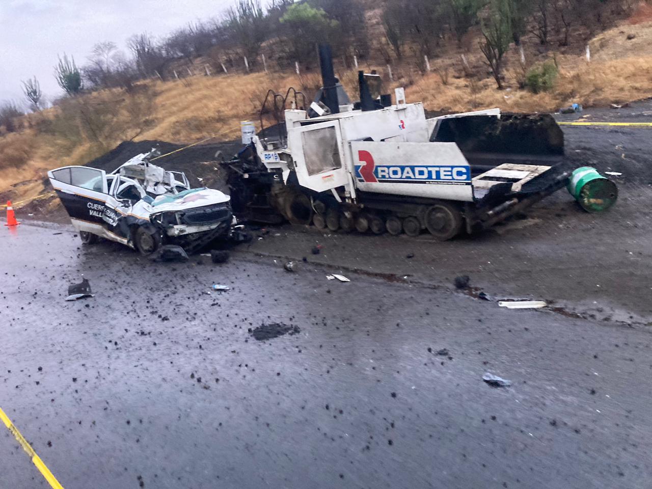 Para atender la emergencia, de inmediato acudieron paramédicos de autopista, mismos que localizaron siniestrado un vehículo patrulla, tipo Aveo, de color blanco y azul, con balizamiento del Cuerpo de Seguridad Auxiliar y placas L41-21 del Estado de México, el cual impactó de frente contra una máquina que realiza reencarpetado en la zona.