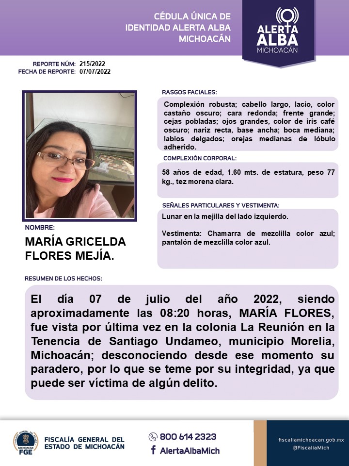 AYÚDANOS A ENCONTRARLA Seguridad 13 de agosto de 2022 Pedimos su ayuda para localizar a María Gricelda Flores Mejía, quien fue vista por última vez en la Tenencia de Santiago Undameo el pasado 7 de julio. Agradecemos cualquier información que ayude a dar con su paradero lili Cuota FacebookTwitterWhatsAppEmailTelegram Noticias MAS VISTAS Morelia Al gobernador no le han informado sobre bazares en Morelia: Alfonso Martínez Artemio Nava - 30 de agosto de 2022 Seguridad Accidente de camión trocero deja un adulto mayor herido en la carretera Zitácuaro-Aputzio de Juárez Artemio Nava - 18 de noviembre de 2025 Estado BENEFICIA A 45 MUNICIPIOS MICHOACANOS CON LA APROBACIÓN DE 115 OBRAS: SEMIGRANTE lili - 2 de octubre de 2017 Seguridad Tráiler cargado con rollos de acero se incendia tras accidente en la autopista Siglo XXI Artemio Nava - 18 de noviembre de 2025 Seguridad Fatal choque de frente en Zacapu deja una persona sin vida Artemio Nava - 18 de noviembre de 2025 Estado Los obispos del país «no podemos ser indiferentes» ante realidad de asesinatos, secuestros, desplazados, inseguridad y delincuencia organizada Artemio Nava - 18 de noviembre de 2025 Estado Comienzan a darse de alta en el ISSSTE 5 mil docentes jubilados de Michoacán Artemio Nava - 18 de mayo de 2023 Estado Firman convenio de colaboración la CEDH y la Junta de Asistencia Privada Artemio Nava - 18 de noviembre de 2025 Economía Aumenta 0.2 % el volumen de la producción manufacturera, en septiembre Artemio Nava - 18 de noviembre de 2025 Educación Profesora de la UMSNH, elegida por su trabajo entre aproximadamente 17 mil investigadores en el ranking Research.com. Artemio Nava - 18 de noviembre de 2025 Noticias Relacionadas Seguridad Hombre muere en zona cerril de Purépero, sufrió una aparatosa caída y un escopetazo 18 de noviembre de 2025 Seguridad Tráiler cargado con rollos de acero se incendia tras accidente en la autopista Siglo XXI 18 de noviembre de 2025 Seguridad Accidente de camión trocero deja un adulto mayor herido en la carretera Zitácuaro-Aputzio de Juárez 18 de noviembre de 2025 Seguridad Fatal choque de frente en Zacapu deja una persona sin vida 18 de noviembre de 2025
