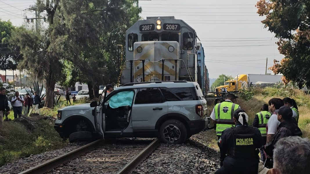 Una camioneta quedó dañada tras ser embestida por el tren en el Sector Independencia del periférico de Morelia, trascendió en la labor periodística.