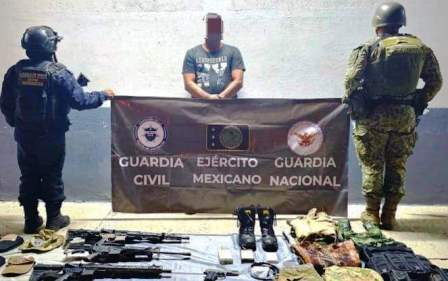 Apatzingán, Mich.- Un presunto integrante del Cártel Jalisco Nueva Generación (CJNG), al cual le decomisaron armamento y equipo táctico, fue arrestado por militares, guardias nacionales y guardias civiles en la población apatzinguense de Las Anonas, dijeron contactos oficiales.