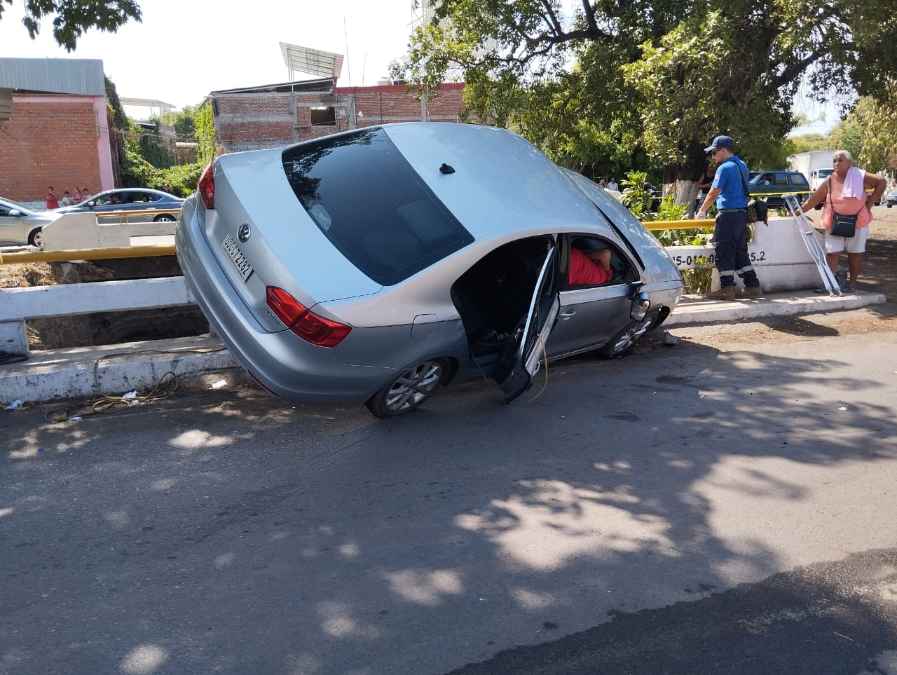 Luego del choque el Jetta terminó encima del barandal de un puente, hasta donde se aproximaron los empistolados y le dispararon en al menos 3 ocasiones, para enseguida huir corriendo, dejando abandonado el Honda, el cual resultó contar con reporte de robo.