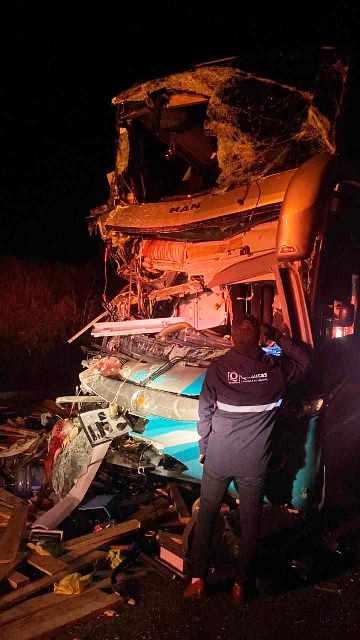 El aparatoso accidente fue reportado cerca de las 03:30 horas, en el kilómetro 228, cerca de la desviación al aeropuerto, donde terminó con el frente destrozado un ómnibus tipo panorámico de dos pisos.