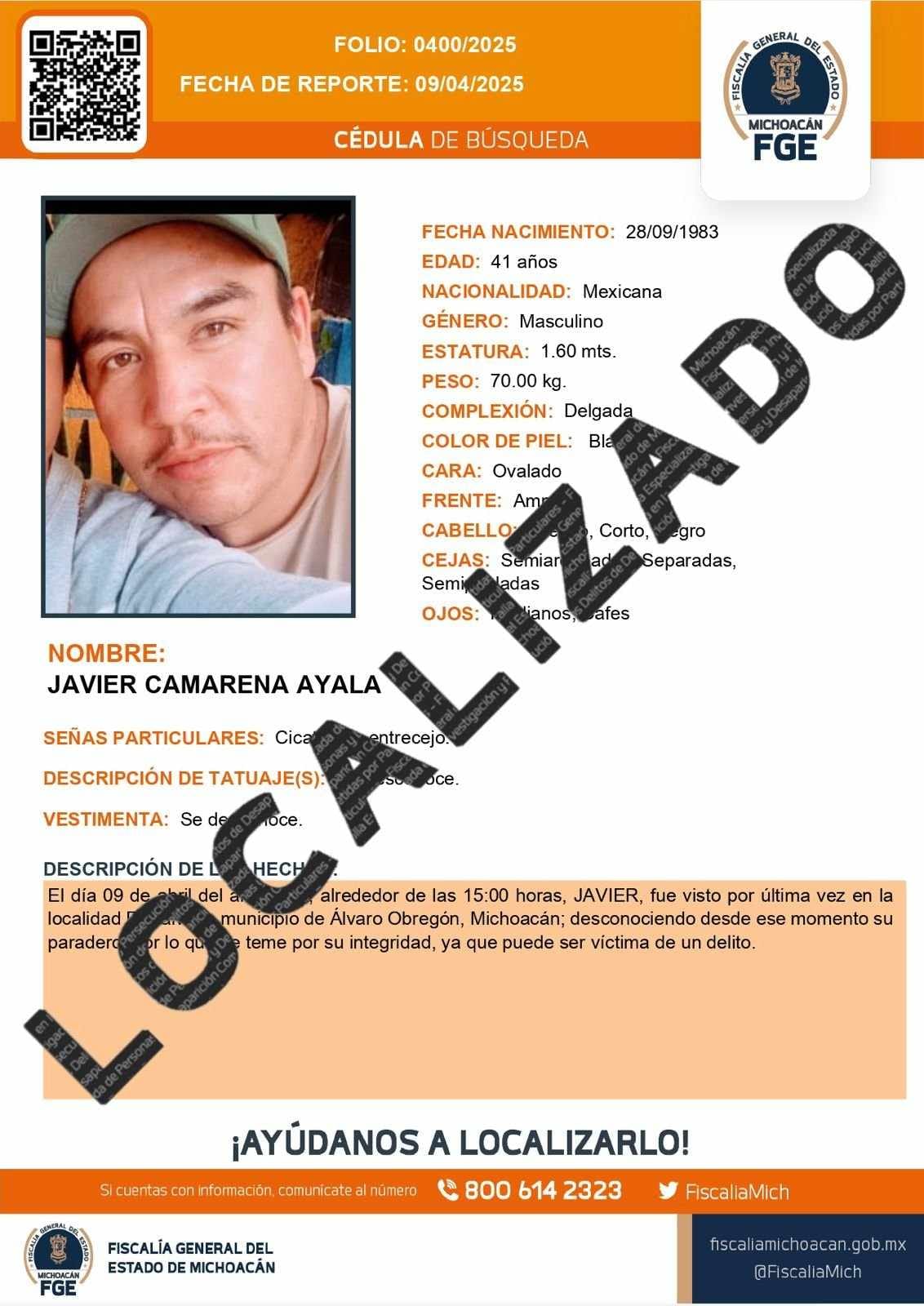 Minutos después, la FGE difundió una cédula de búsqueda de Javier con su media filiación. Posteriormente, civiles y patrulleros hallaron la combi de Javier Camarena, la cual estaba abandonada en un solitario paraje. Y horas después, la Fiscalía avisó sobre la localización con vida del mencionado masculino. RED 113 MICHOACÁN/Redacción