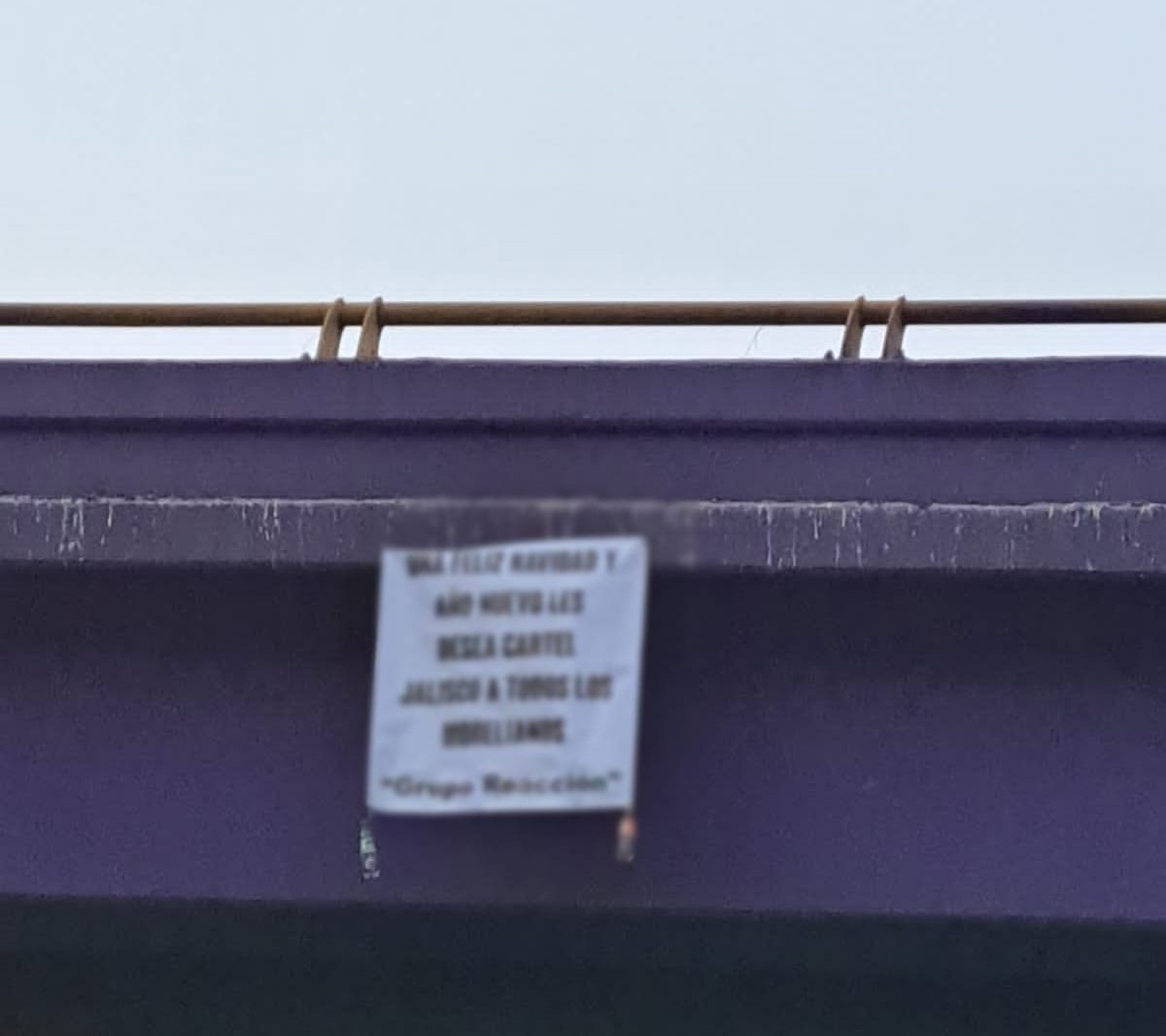 Esta mañana de navidad, en un puente vehicular de Morelia, desconocidos colocaron una lona en la que «desean» feliz navidad a los morelianos, rótulo que estaba formado por el Cartel Jalisco.