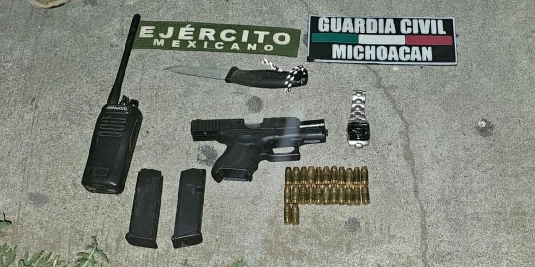 Uruapan, Michoacán.- Dentro de los operativos interinstitucionales que se mantienen en esta región de Uruapan, el personal de la Guardia Civil de la Secretaría de Seguridad Pública (SSP) y del Ejército Mexicano (Sedena) detuvieron a dos presuntos integrantes de una célula delincuencial, los cuales podrían estar relacionados con eventos de homicidio doloso, sucedidos recientemente.