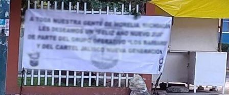 Policias detuvieron a dos jóvenes en poder de una bolsa que contenía una manta con un mensaje de «feliz Año Nuevo a los morelianos», el cual aparentemente está firmado por el Cartel Jalisco Nueva Generación (CJNG), informaron autoridades policiales.