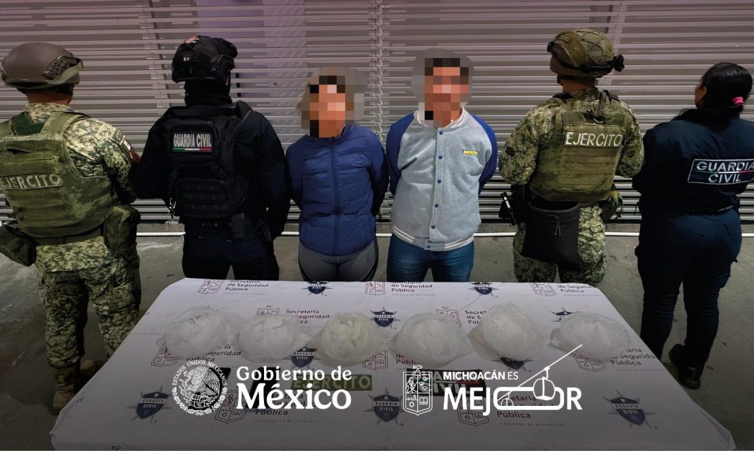 Elementos de las secretarías de Seguridad Pública (SSP) y de la Defensa Nacional (Defensa) detuvieron a dos personas en posesión de cinco kilogramos de enervante, a quienes les aseguraron un vehículo en la ciudad de Morelia.