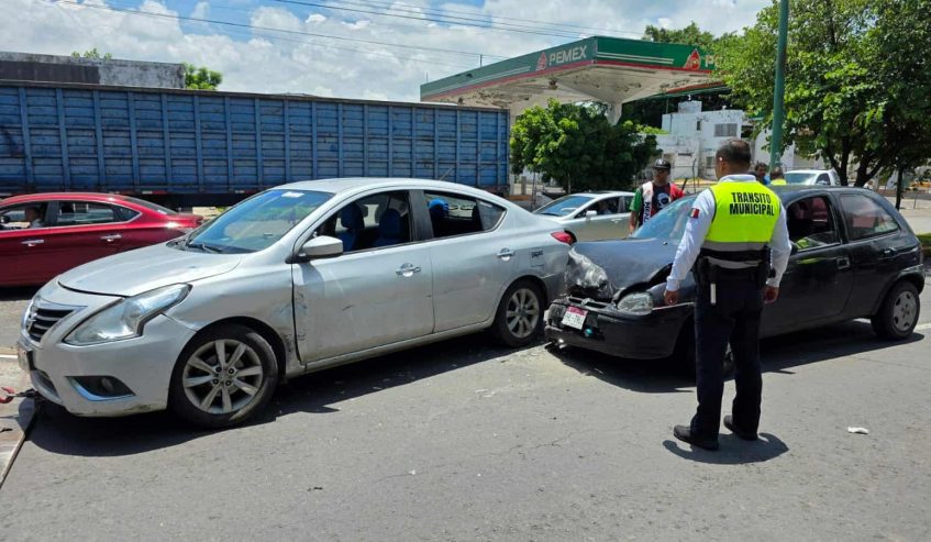 El aparatoso accidente tuvo lugar sobre la Avenida Juárez a la altura de la antigua gasolinera, donde colisionaron un auto Nissan Versa, de color gris, con placas PHC-585-B y un vehículo Chevrolet Chevy de color negro, con matrícula PHL-798-E.