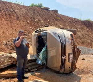 Apenas cuatro kilómetros más adelante, en el kilómetro 100+800, un automóvil, compacto, de color gris, volcó aparatosamente y quedó sobre su costado izquierdo junto a un montón de tierra, lugar, sus dos ocupantes quedaron heridos.