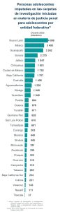 En 2023, 6 entidades federativas concentraron 50.7 % de las 32 mil 852 personas adolescentes imputadas en carpetas de investigación: Nuevo León, estado de México, Guanajuato, Sonora, Jalisco y Chihuahua.