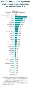 Las 3 entidades federativas con las tasas más altas fueron Aguascalientes (95.1), Nayarit (62.7) y Sonora (58.7). En 2023, el estado de México, Ciudad de México, Sonora, Baja California, Aguascalientes y Chihuahua concentraron 54.4 % de las personas adolescentes que ingresaron a los centros de internamiento del país.