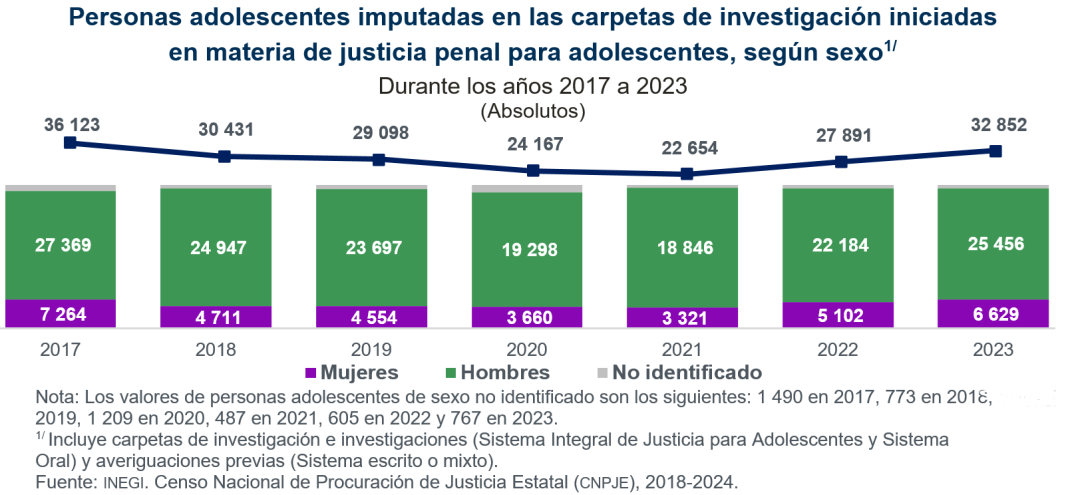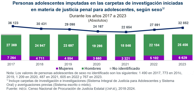 De 2017 a 2021, el total de las personas adolescentes imputadas en carpetas de investigación bajó 37.3 % (de 36 mil 123 a 22 mil 654). Sin embargo, entre 2021 y 2023, el total subió a 32 mil 852, un aumento de 42.2 %.