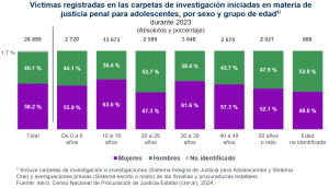 Durante 2023, se registraron 28 mil 899 víctimas en las carpetas de investigación iniciadas en materia de justicia penal para adolescentes. De este total, 6 de cada 10 fueron mujeres y 56.7 % tenía 19 años de edad o menos.