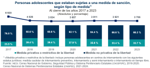 Al cierre de 2023, había 3 785 personas adolescentes con alguna medida de sanción: 66.3 % se encontraba con medida no privativa de la libertad y 33.7 % tenía alguna medida privativa o restrictiva de la libertad.