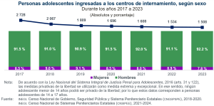 Durante 2023, 1 508 personas adolescentes ingresaron a los centros de internamiento estatales del país, de las cuales, 9 de cada 10 fueron hombres. Entre 2017 y 2023, el número de personas adolescentes ingresadas a los centros de internamiento disminuyó 45 %, al pasar de 2 728 a 1 508.