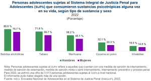 En 2022, 88.2 % de los hombres y 77.3 % de las mujeres adolescentes sujetas al sistema de justicia penal mencionaron haber consumido sustancias psicotrópicas alguna vez en su vida. Las 3 principales sustancias que se consumieron fueron alcohol, tabaco y marihuana.